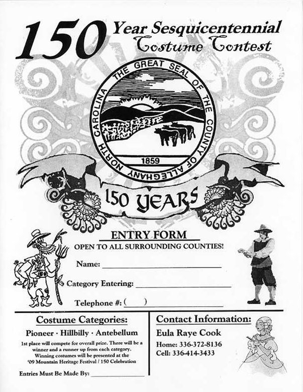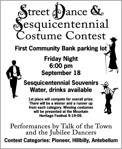 The Sesquicentennial Costume Contest will take place during a street dance, Friday night, September 18, 2009 at the First Community Bank in Sparta, NC.